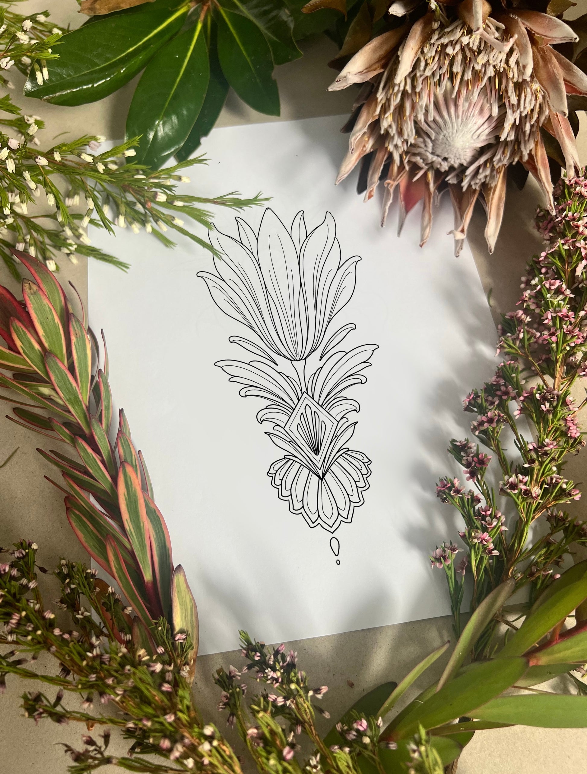 Ornamental flower notes: This design is best suited to a forearm, shin, back of the calf, or spine. It could be tattooed as small as 14cm tall but would be best suited to around 20cm tall to allow for more detail. A half day would be appropriate for a height of 20cm or smaller ($775). A full day will be needed for anything larger ($1500).