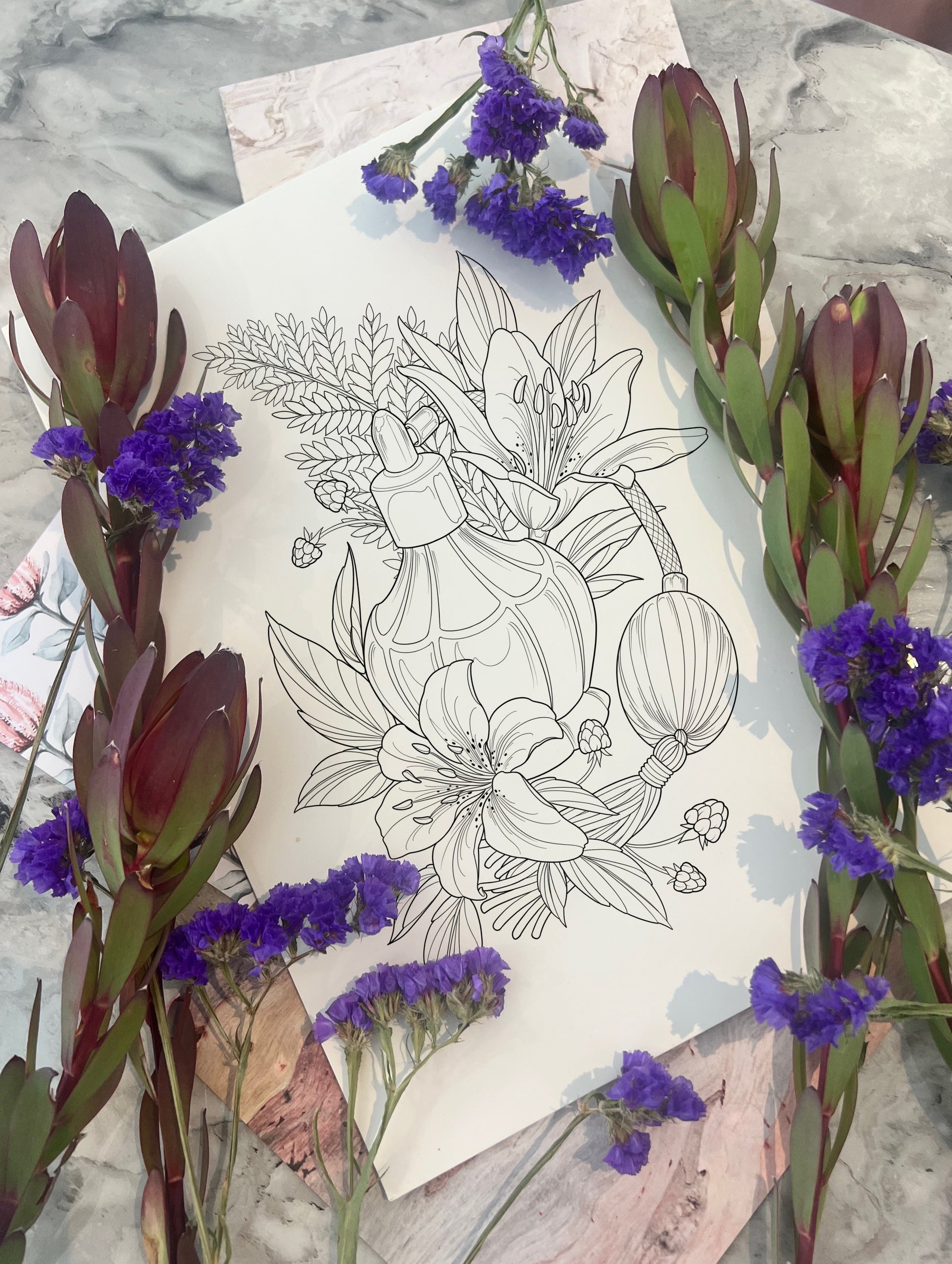Perfume notes: This design is best suited to a calf, forearm or thigh. It could be tattooed as small as 14cm tall (in this case a half day appointment would be appropriate). For anything 18cm tall + we will require a full day booking.