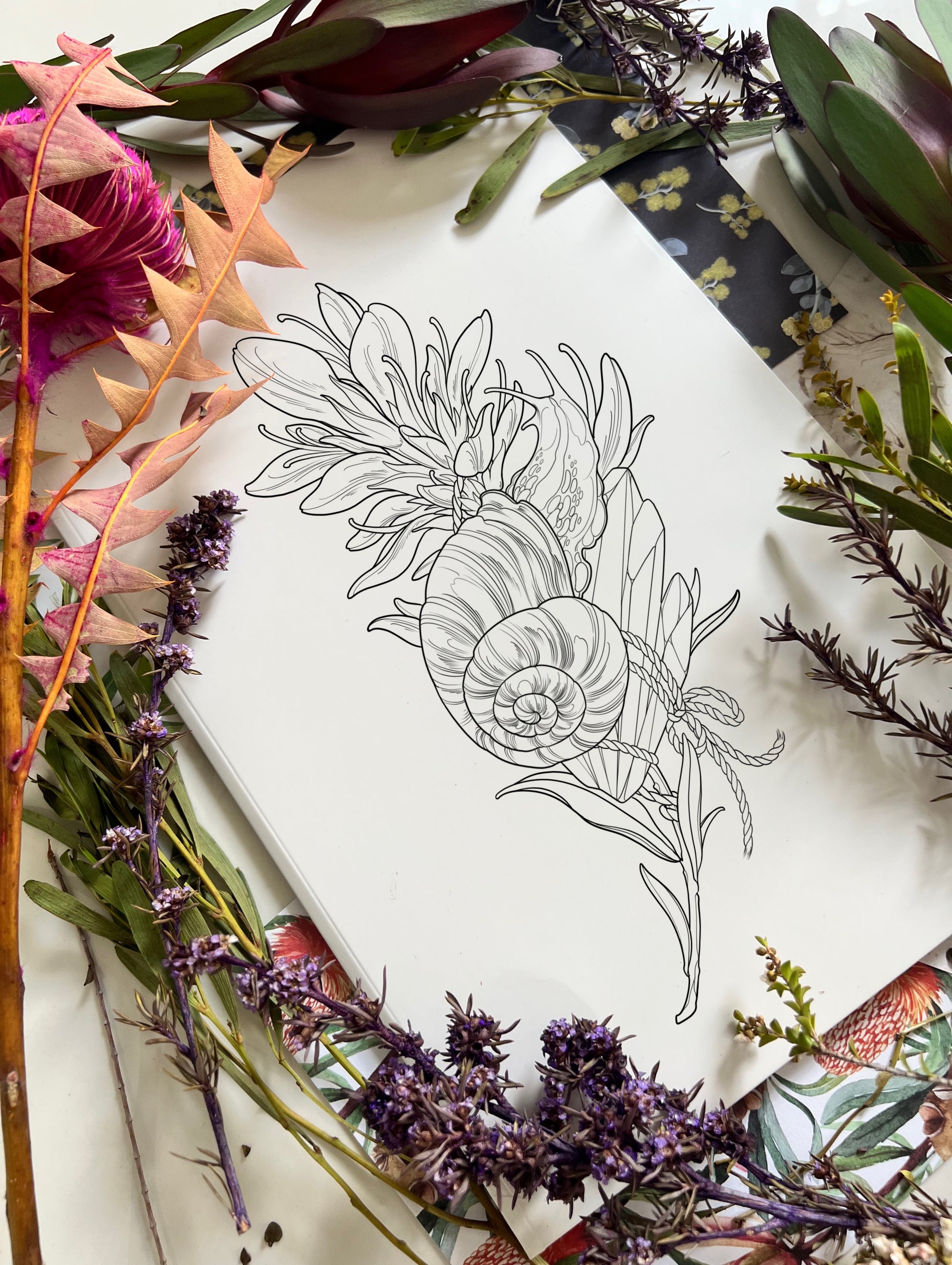 Snail and crystal notes: This design is best suited to a calf, forearm, bicep or thigh. Due to the level of detail it should be tattooed at a minimum of 20cm tall and a full day booking will be needed ($1500).